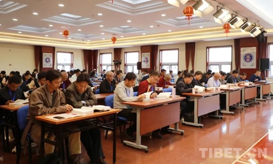 སྐབས་བཅུ་བཞི་པའི་རྒྱལ་ཡོངས་བོད་ལུགས་གསོ་རིག་མཐོ་རིམ་ཟབ་སྦྱོང་འཛིན་གྲྭའི་སློབ་མས་སློབ་ཚན་ལ་ཉན་བཞིན་པ།