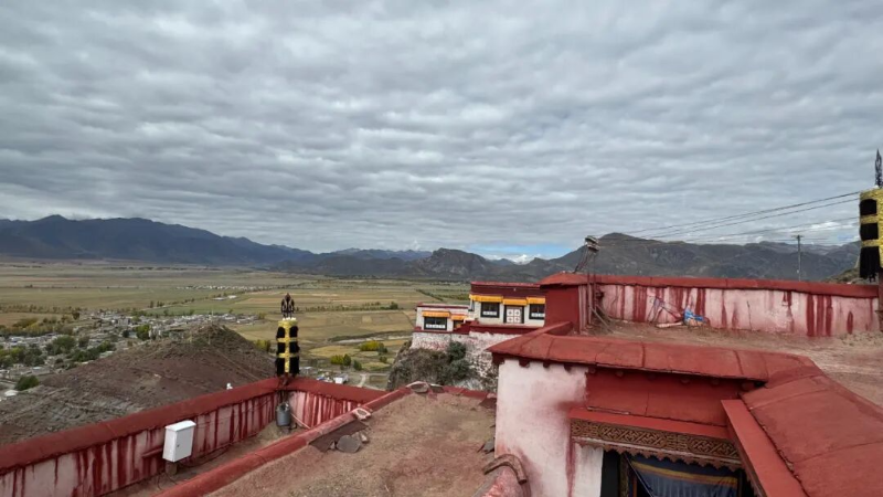 ང་ཚོ་ཤར་དགོན་དུ་འབྱོར་དུས་ཕྱི་དྲོར་སླེབས་འདུག དགོན་པའི་རྒྱབ་རི་ཀླུ་མོ་རྒྱལ་ཆེན་རྣམ་སྲས་སྐུ་གཟུགས་ཀྱི་ས་འཛིན་ཆེན་པོ་མཐོ་ཞིང་བརྗིད། མདུན་ཕྱོགས་ཀྱི་དར་ཡུལ་ལུང་གཞུང་ཡངས་ཤིང་རྒྱ་ཆེ། དར་ཡུལ་ཕུ་ནས་འབབ་པའི་དར་ཆུ་རིང་མོས་ལུང་གཞུང་འདི་ཆ་གཉིས་སུ་ཕྱེ་ཞིང་། ལུང་གཞུང་གི་ས་ཞིང་ནི་མུ་དང་མཐའ་མེད་པ་ལྟར་མིག་ལ་སྣང་། སྟོན་མཇུག་གི་ལོ་ལེགས་ཀྱིས་ལུང་གཞུང་ཧྲིལ་བོར་གསེར་ཞུན་གྱི་ཁུ་བ་བྱུགས་པ་བཞིན་སེར་ལམ་ལམ་བྱེད། མཚམས་སྤྲིན་གྱི་ཉི་ཟེར་ཁྲོད་མངོན་པའི་སྟོན་མཇུག་གི་སོག་ཤུལ་དང་ལམ་འགྲམ་གྱི་བ་ལང་། ཞིང་རྩྭ་འདྲུད་པའི་འཁོར་ལོ། ད་དུང་བོད་ཀྱི་གནའ་ཉམས་མ་ཤོར་བའི་གྲོང་སྡེ་སོགས་སྣོད་བཅུད་ཀྱི་བཀོད་པ་མཐའ་དག་ནི། རི་མོ་མཁན་གྱི་པིར་རྩེ་ལས་མངོན་པའི་སྣུམ་ཚོན་རི་མོ་ཞིག་དང་འདྲ། གསེར་མདོག་གི་ལུང་གཞུང་འདིར་ཆགས་པའི་བཀའ་གདམས་པའི་དགོན་སྡེ་དག་ནི་ལུང་བའི་ཕུ་དང་མདའི་རི་ཕྲན་ཆུང་ངུ་དག་ཏུ་ཕྱག་བཏབ་ཡོད། དགོན་པ་དག་ཏུ་འབུམ་པ་དཀར་པོའི་མཆོད་རྟེན་གྱི་ཚོམས་ཀྱིས་མཛེས་པར་ཁེངས་པ་ནི་སྤྱིར་བཀའ་གདམས་པ་དང་སྒོས་འཕན་པོའི་ཡུལ་གྱི་དགོན་སྡེའི་ཁྱད་ཆོས་ཐུན་མོང་མ་ཡིན་པ་ཞིག་ཡིན། གལ་སྲིད་ནམ་མཁའི་མཐོངས་ལས་མར་གཟིགས་ཚེ། གསེར་གྱི་ལུང་གཞུང་འདིར་བྱུ་རུ་དཀར་པོས་ཕྲ་བཏབ་པ་བཞིན་མིག་ལམ་དུ་སྣང་ཐུབ་པར་བསམས།