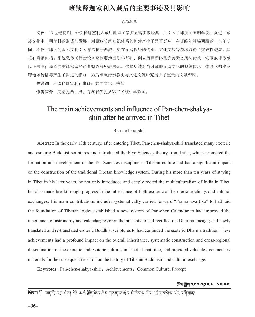 པཎ་ཆེན་ཤཱཀྱ་ཤྲི་བོད་དུ་བཞུགས་སྐབས་ཀྱི་མཛད་པ་གཙོ་བོ་དང་དེའི་ཤུགས་རྐྱེན་ལ་དཔྱད་པ། བན་དེ་བཀྲ་ཤིས།
