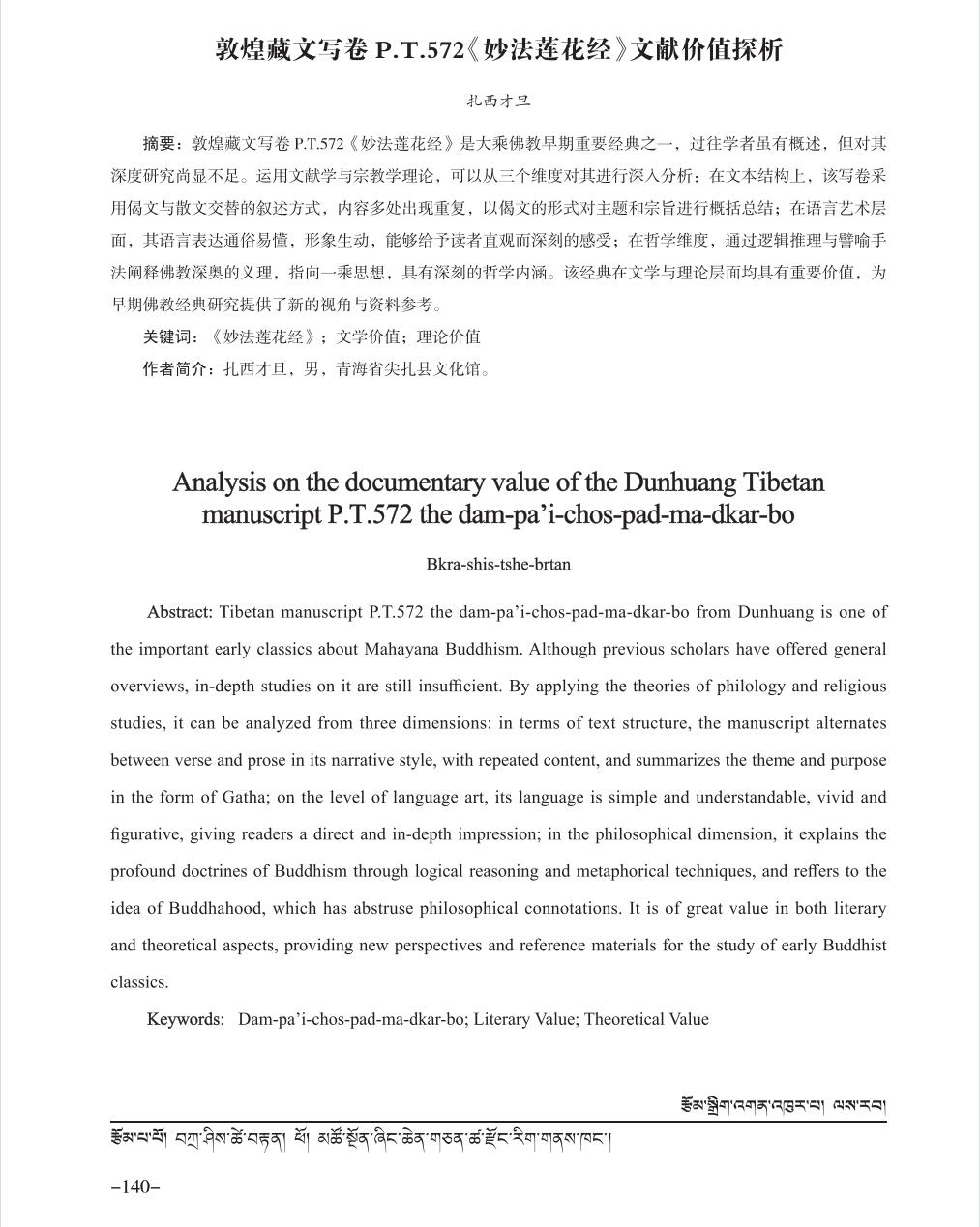 ཏུན་ཧོང་ཤོག་དྲིལP.T.572《དམ་པའི་ཆོས་པདྨ་དཀར་པོ》ཡི་ཡིག་ཚང་གི་ཁྱད་ཆོས་ལ་རགས་ཙམ་དཔྱད་པ། བཀྲ་ཤིས་ཚེ་བརྟན།