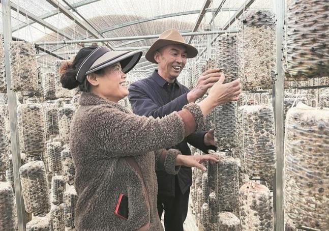 པདྨ་རྫོང་མཐོ་སྒང་ཤ་མོ་རིགས་འདེབས་འཛུགས་དཔེ་སྟོན་རྟེན་གཞིའི་འགན་ཁུར་བ་ཝང་ཏེ་ཅུན(གཡས)དང་བཟའ་ཟླ་གཉིས་ཀྱིས་ཤ་མོའི་སྐྱེ་ཚུལ(菌包)ལ་ལྟ་ཞིབ་བྱེད་པ།