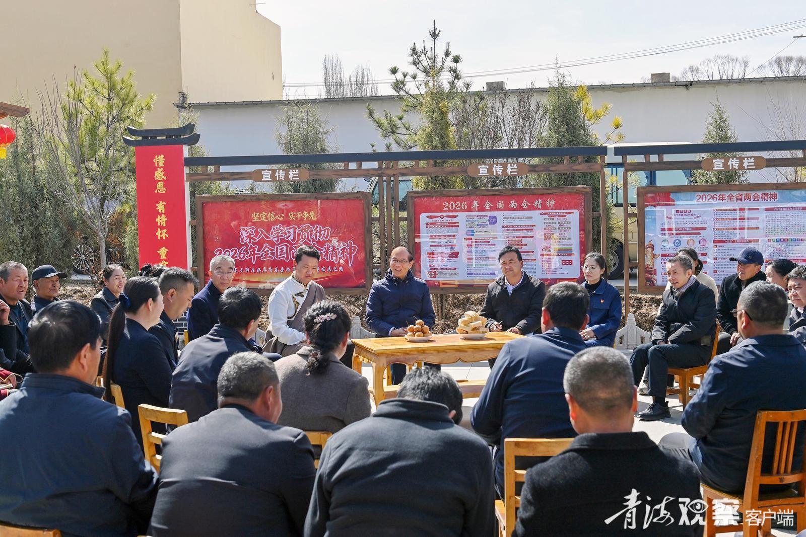 དཔྱིད་རླུང་གི་རྒྱུ་བ་འཇམ་པོས་སྐྱེ་དངོས་ཐམས་ཅད་གཉིད་ལས་སློང་བཞིན་ཡོད། རྨ་ཤར་ཞང་ཁྲེ་ཙེ་ཞོལ་མའི་ཏང་དམངས་ཞབས་ཞུའི་ལྟེ་གནས་ཐང་ཆེན་དུ། ཝུའུ་ཞའོ་ཅུན་གྱིས་གཞི་རིམ་ཏང་ཡོན་ལས་བྱེད་པ་དང་ཕྱུག་འགྱུར་སྣེ་ཁྲིད་པ། ཞིང་པ་ཁེ་ལས་པ། རོང་འབྲོག་མང་ཚོགས་བཅས་དང་མཉམ་དུ་བསྡད་དེ། ཚང་མས་འགྱུར་ལྡོག་གླེང་བ་དང་མྱོང་ཚོར་བཤད་པ། འཆར་གཞི་གླེང་བ་བཅས་ལ་ཉན་པ་དང་། རྒྱལ་ཡོངས་ཚོགས་འདུ་གཉིས་ཀྱི་དགོངས་དོན་སྒྲོག་འགྲེལ་བྱས། ཁོང་གིས་བསྟན་དོན།“ལོ་ལྔའི་འཆར་འགོད་བཅོ་ལྔ་པའི”དུས་སྐབས་ནི། མཚོ་སྔོན་གྱིས་རྒྱལ་ཡོངས་དང་མཉམ་དུ་སྤྱི་ཚོགས་རིང་ལུགས་དེང་རབས་ཅན་གཞི་རྩའི་ཆ་ནས་མངོན་འགྱུར་བྱེད་པའི་གནད་འགག་གི་དུས་སྐབས་ཤིག་ཡིན་པར་བརྟེན། ཐོག་མཐའ་བར་གསུམ་དུ“རྒྱལ་དོན་གྱི་ཆེ་ཕྱོགས”བློ་ལ་བརྟན་པོར་བཅངས་ནས། “ཀྲུང་ཧྭའི་ཆུ་མཛོད”ལ་སྲུང་སྐྱོབ་ཡག་པོ་བྱས་ཏེ། འབྱུང་རྩ་ནས་འགན་འཁྲི་ནན་མོ་འཁུར་བ་དང་ཆུ་རྒྱུན་གཙོ་བོའི་འགན་འཁྲི་མངོན་པར་བྱས་ནས། རང་ཉིད་ཀྱི་མིག་འབྲས་ལ་སྲུང་སྐྱོབ་བྱེད་པ་ནང་བཞིན“རྨ་ཀླུང་སྔོན་མོར”སྲུང་སྐྱོབ་ཡག་པོ་བྱེད་དགོས། ཡུལ་བབ་དང་བསྟུན་ནས་ཁྱད་ལྡན་ཐོན་ལས་ཡག་པོ་མ་ནོར་བའི་སྒོ་ནས་འདེམས་ཏེ། ཞིང་ལས་ལ་ཚན་རྩལ་གྱིས་གཞོགས་འདེགས་བྱས་ནས་ཐོན་ལས་མུ་ཕྲེང་རྒྱུན་ཆད་མེད་པར་རིང་དུ་གཏོང་བ་དང་ཟུར་སྣོན་རིན་ཐང་མཐོ་རུ་གཏོང་བ། ཐོན་ལས་དར་རྒྱས་ལ་བརྟེན་ནས་གྲོང་གསེབ་དར་སྤེལ་ཡོང་བར་སྐུལ་ཁྲིད་བྱེད་པ་བཅས་བྱས་ཏེ། མི་དམངས་ཀྱི་དངུལ་ཁུག་ཇེ་མཐུག་ཏུ་གཏོང་བ་དང་འཚོ་བ་སྔར་ལས་ཇེ་ཡག་ཏུ་གཏོང་དགོས། དམངས་འཚོ་གཙོ་བོར་འཛིན་རྒྱུ་རྒྱུན་འཁྱོངས་བྱེད་པ་དང་། མི་རིགས་སོ་སོའི་མང་ཚོགས་ཀྱི་དཀའ་ངལ་དང་སེམས་ཁྲལ་ལ་དམ་པོར་དམིགས་ཏེ། སློབ་གསོ་དང་སྨན་བཅོས། རྒན་གསོ། གད་སྙིགས་དང་བཙོག་ཆུ་གཙང་སེལ་སོགས་ཀྱི་དམངས་འཚོའི་དོན་དངོས་ཡག་པོ་བསྒྲུབས་ནས། ཀྲུང་ཧྭ་མི་རིགས་ཀྱི་ཐུན་མོང་ཚོགས་པའི་འདུ་ཤེས་བརྟན་པོར་བསྐྲུན་ཏེ། མི་རིགས་སོ་སོའི་མང་ཚོགས་མཐུན་སྒྲིལ་འཆམ་མཐུན་དང་བདེ་སྐྱིད་དུས་བདེ་ཡི་ངང་འཚོ་བ་རོལ་དུ་འཇུག་དགོས། གཞི་རིམ་ཏང་རྩ་འཛུགས་ཀྱི་འཛུགས་སྐྲུན་བྱེད་ཤུགས་ཆེ་རུ་གཏོང་བ་དང་། རྒྱ་ཆེའི་ཏང་ཡོན་ལས་བྱེད་པས་ཐོན་ལས་འཕེལ་རྒྱས་དང་ཁོར་ཡུག་བཅོས་སྐྱོང་། འགལ་བ་འདུམ་འགྲིག་བཅས་ཀྱི་ཁྲོད་དུ་ནུས་པ་འདོན་སྤེལ་གང་ལེགས་བྱེད་ཐུབ་པར་ཁྲིད་སྟོན་བྱས་ཏེ། ཏང་གི་སྲིད་སྐྱོང་རྨང་གཞི་རྒྱུན་ཆད་མེད་པར་ཇེ་བརྟན་དུ་གཏོང་དགོས།
