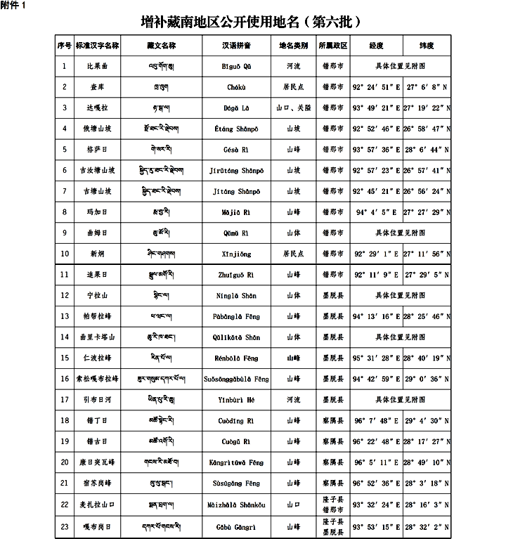 རྒྱལ་སྲིད་སྤྱི་ཁྱབ་ཁང་གི་ས་མིང་དོ་དམ་གྱི་འབྲེལ་ཡོད་གཏན་འབེབས་གཞིར་བཟུང་སྟེ། དམངས་སྲིད་པུས་འབྲེལ་ཡོད་སྡེ་ཚན་དང་མཉམ་དུ་རང་རྒྱལ་གྱི་བོད་ལྗོངས་མོན་རྟ་དབང་གི་ས་མིང་ཁག་ཅིག་ཚད་ལྡན་དུ་བཟོས། ད་ལྟ་ཁག་དྲུག་པའི་མོན་རྟ་དབང་གི་ས་མིང(བསྡོམས་པས23)ཁ་སྣོན་བྱས་པ་དངོས་སུ་ཁྱབ་བསྒྲགས་བྱས་པ་ཡིན།