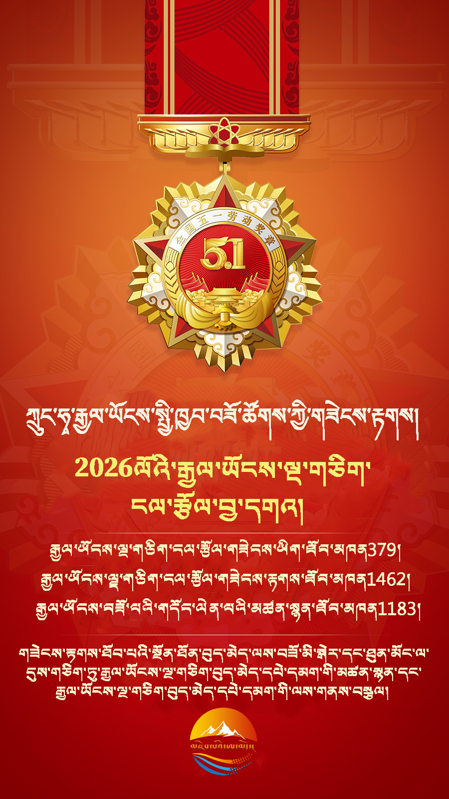 2026ལོའི་ལྔ་གཅིག་རྒྱལ་སྤྱིའི་ངལ་རྩོལ་དུས་ཆེན་སླེབས་ལ་ཉེ་བའི་ཆར། རྒྱལ་ཡོངས་སྤྱི་ཁྱབ་བཟོ་ཚོགས་ཀྱིས་ཟླ4ཚེས28ཉིན་ལ་གཟེངས་རྟགས་ཚོགས་ཆེན་བསྡུས་ཏེ། རྒྱལ་ཡོངས་ཀྱི་དཔེ་བཟང་མི་སྣ3024ལ་མཉམ་དུ་ལྔ་གཅིག་ངལ་རྩོལ་གཟེངས་རྟགས་གནང་། དེའི་ནང་རྒྱལ་ཡོངས་ལྔ་གཅིག་ངལ་རྩོལ་གཟེངས་ཡིག379དང་རྒྱལ་ཡོངས་ལྔ་གཅིག་ངལ་རྩོལ་གཟེངས་རྟགས1462། རྒྱལ་ཡོངས་བཟོ་བའི་གདོང་ལེན་པའི་མཚན་སྙན་ཐོབ་མཁན1183ཡོད་པ་རེད། དེ་ལས་མཚོ་སྔོན་ལ་རྒྱལ་ཡོངས་ལྔ་གཅིག་ངལ་རྩོལ་གཟེངས་ཡིག་ཐོབ་མཁན3དང་། རྒྱལ་ཡོངས་ལྔ་གཅིག་ངལ་རྩོལ་གཟེངས་རྟགས12། རྒྱལ་ཡོངས་བཟོ་པའི་གདོང་ལེན་པའི་མཚན་སྙན་ཐོབ་མཁན11། ཚའེ་མའོ་འཐག་སླས་དུ་རྩྭ(ཐོན་ལས)རྒྱལ་ཡོངས་བཟོ་པའི་གདོང་ལེན་པ1དང་། ཆེད་དོན་ལས་གཞི་ཆེན་མོ་དང་གཙོ་གནད་ལས་ཀའི་རྒྱལ་ཡོངས་ལྔ་གཅིག་ངལ་རྩོལ་གྱི་གཟེངས་རྟགས་ཐོབ་མཁན1བཅས་ཡོད་དོ། །